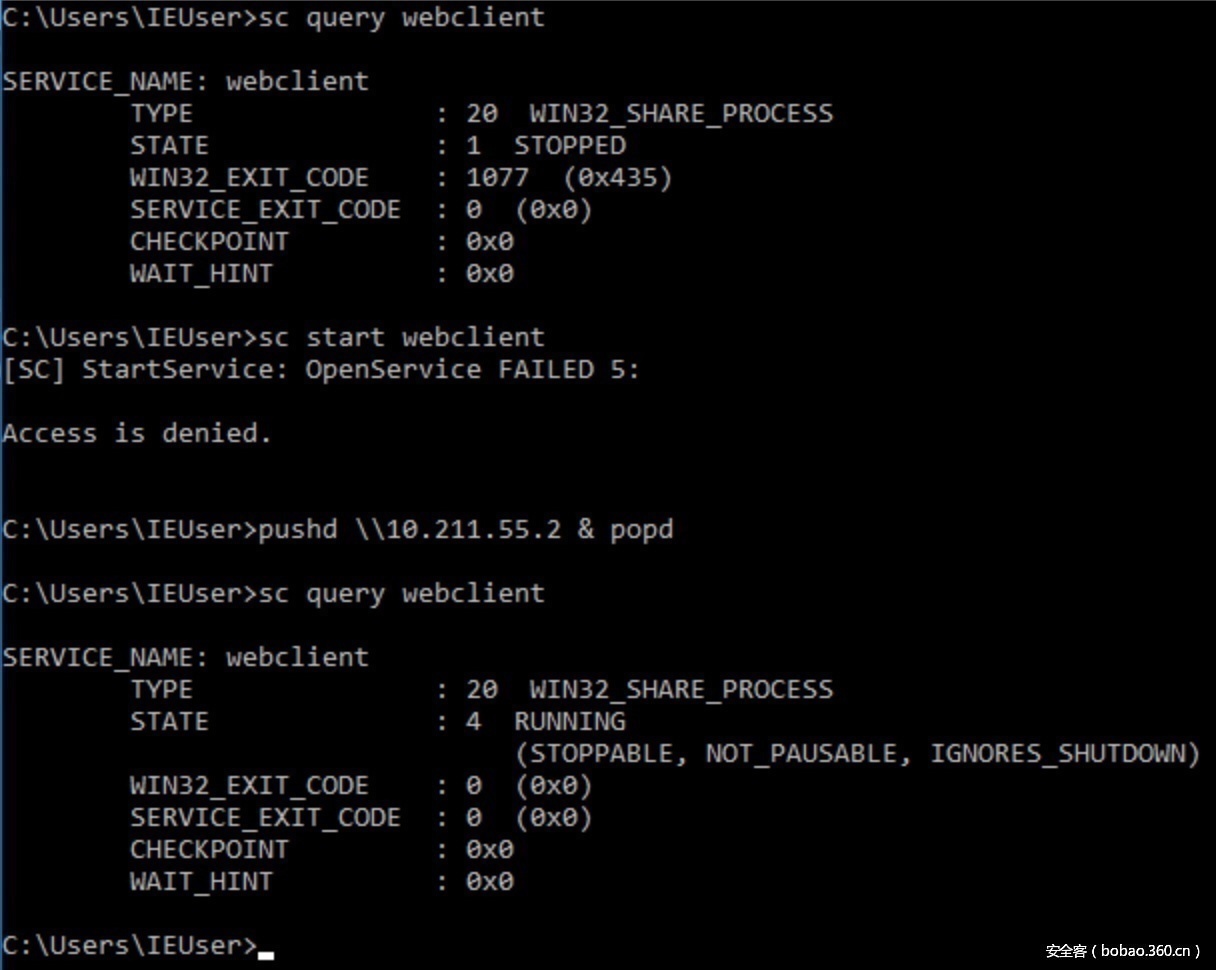 Windows操作系统通过WebClient服务为WebDAV协议提供支持。 必须首先启动此服务,以便命令行工具和Windows API功能可以支持指向WebDAV服务器的UNC路径。 有趣的是,我发现如果WebClient服务没有启动,那么标准用户(即:没有管理员权限)不能通过常规方式启动它(services.msc或sc start webclient),但是使用 pushd \ webdav.server.com 命令映射WebDAV共享上的虚拟驱动器即使从普通用户也将自动启动服务。