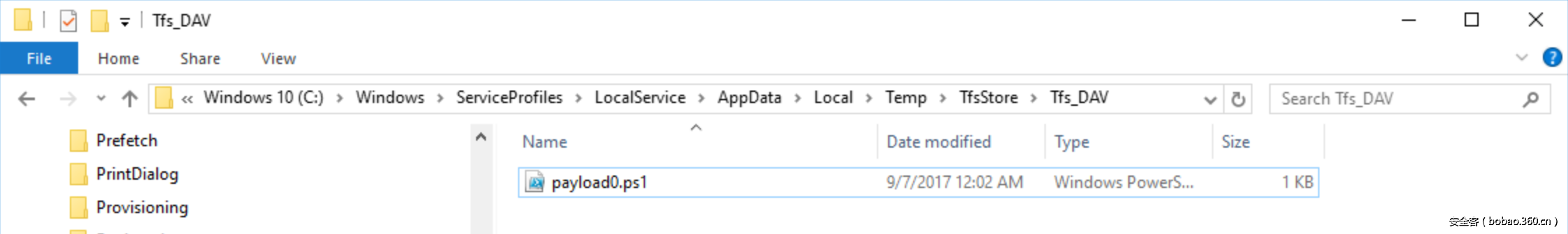 1. 通过上述命令中所示的UNC路径访问/下载的所有有效载荷都会在WedDAV客户端缓存(C:WindowsServiceProfilesLocalServiceAppDataLocalTempTfsStoreTfs_DAV)中本地复制。 这绝对不是对DFIR友好,因为它在磁盘上写,就可能会触发本地防病毒软件。