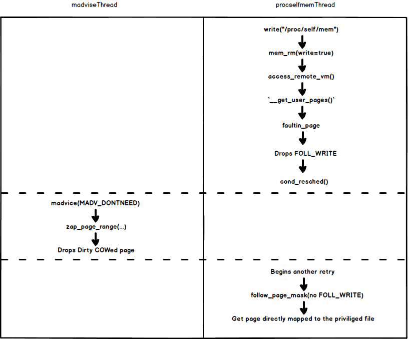 该漏洞是内核函数get_user_pages(mm/gup.c)在处理COW(copy-on-write)过程中,由条件竞争引发未授权进程向只读内存区域写入数据导致的。