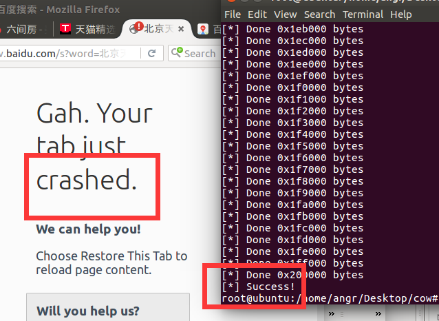 (d)由于浏览器操作指令复杂,我们选取firefox进行测试,不到一会儿,漏洞来了。。。