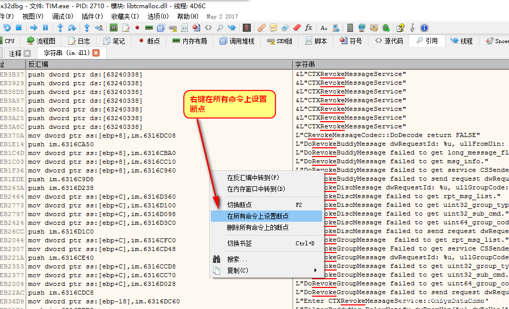 - 由于撤销字符串比较多,为了方便定位代码,可以右键在所有命令上下断点