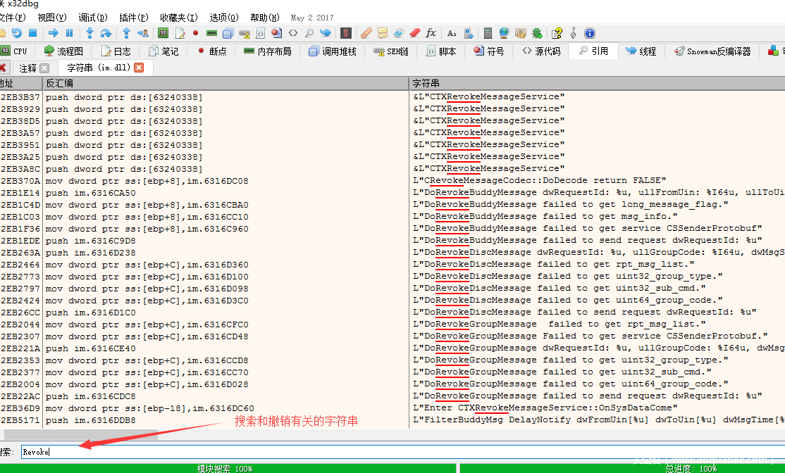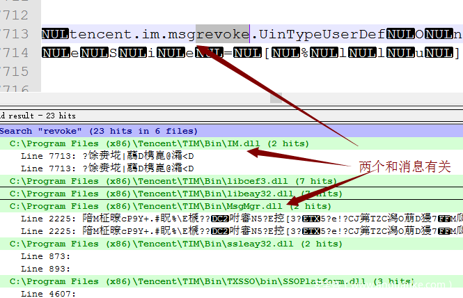 - 可以看到,有两个动态库与消息撤回有关,IM.dll和MsgMgr.dll。其他的根据查询到的字符串,并没有涉及消息。所以优先分析IM.dll和MsgMgr.dll