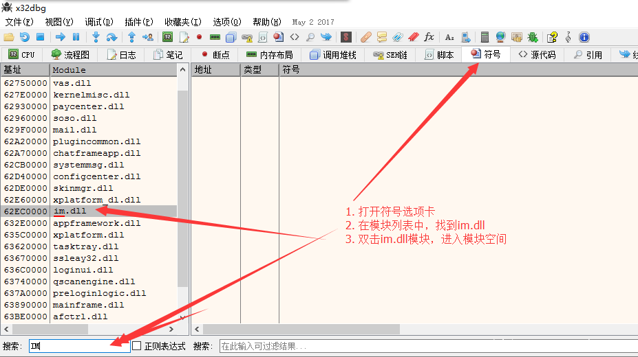 在符号选项卡中找到IM.dll模块,进入其代码空间