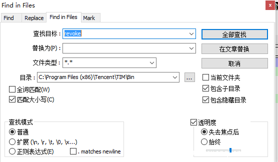 当锁定了关键词之后,使用Notepad++的搜索功能,在文件中搜索。指定文件夹,搜索revoke