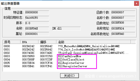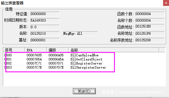 使用PEID或是其他PE文件查看DLL的导出,发现这两个DLL的导出函数都有以下四个函数: