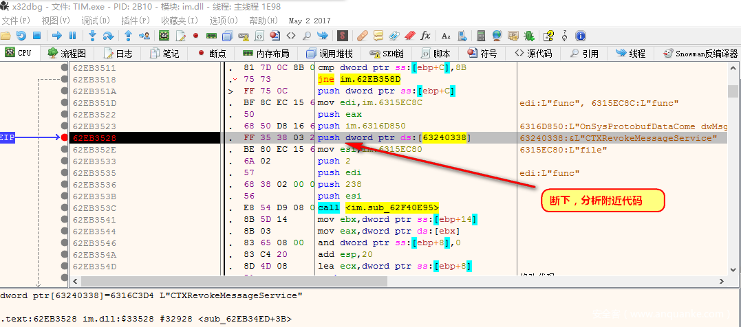 - 再启动一个tim qq,给被调试的tim qq发消息,然后再撤销,发现会断到以下代码处,分析附近的代码。