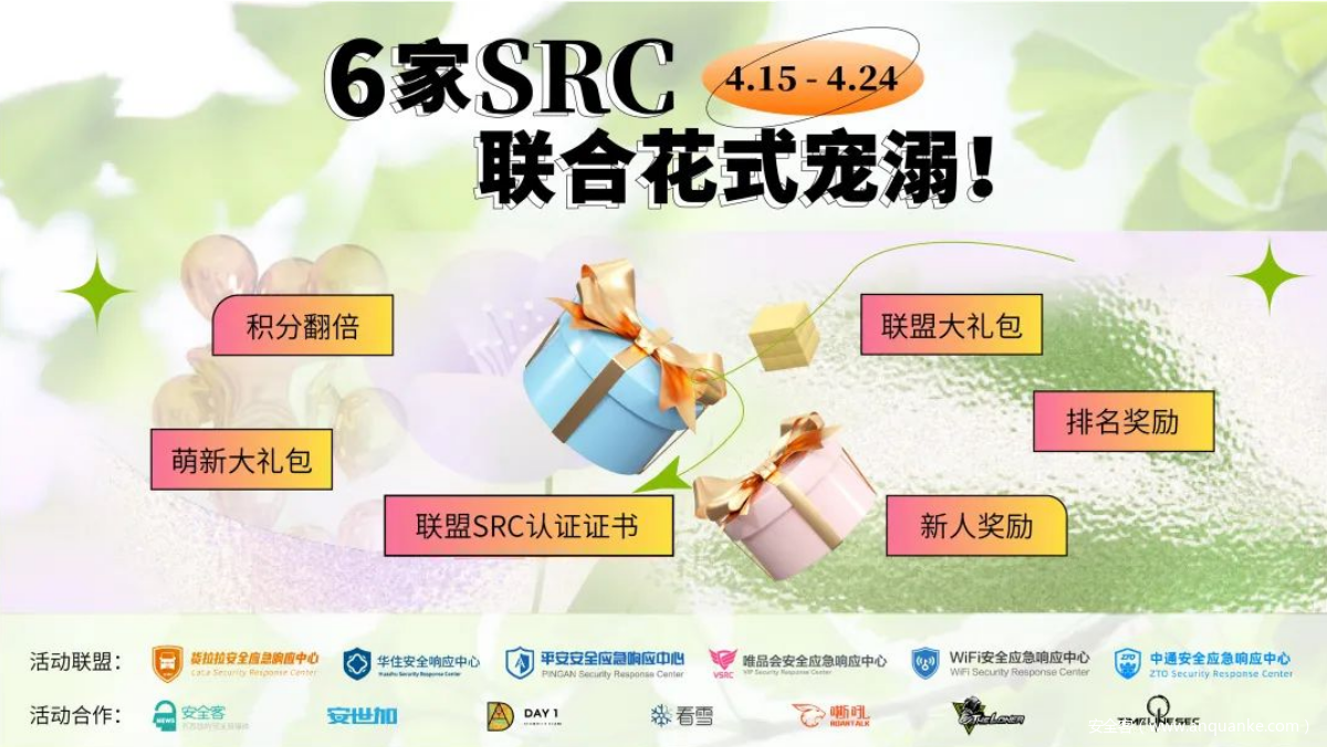 人间最美四月天,不负春光与时行。值此四月,货拉拉SRC联合华住SRC、平安SRC、唯品会SRC、WiFi SRC、中通SRC共同推出“四月联盟”活动,各家SRC奖励加码再加码,还有联盟奖励送不停!这个四月,白帽子师傅们要满载而归吖~~