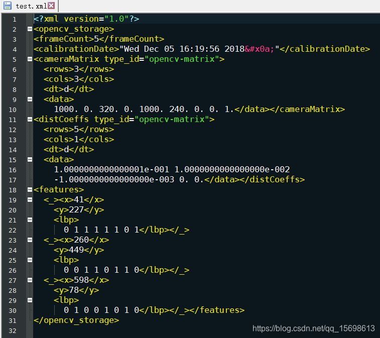 FileStorage fs("test.xml", FileStorage::WRITE); 改为 FileStorage fs("test.yaml", FileStorage::WRITE);