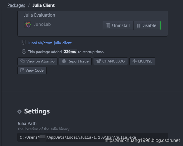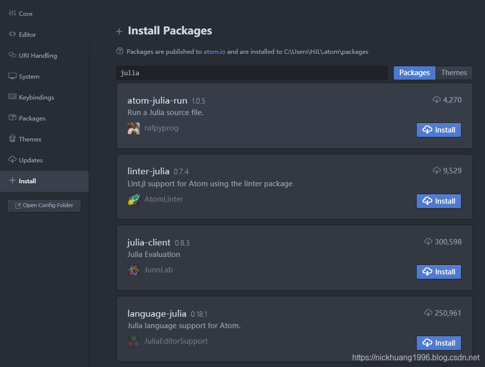 1.settings里+install中搜索julia,可以看到我们需要安装的相关包,我们选择atom-julia-run、julia-client、language-julia安装