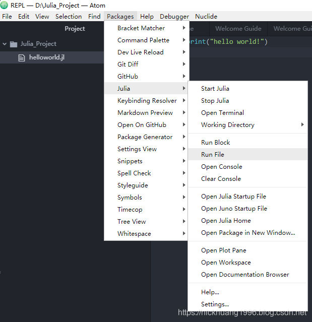 5.具体操作是菜单栏里 Packages->Julia->Run File