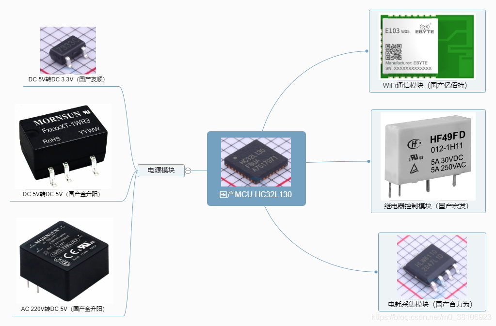 WiFi物联网智能插座的核心元器件均为国产芯片,包括:微控制器、AC 220V转DC 5V模块、DC 5V转DC 3.3V模块、DC 5V转DC 5V隔离模块、WiFi通信模块、继电器模块和电耗采集模块,具体如下所示: