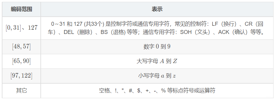 0到9、标点符号,以及在英语中使用的特殊控制字符。 - 简单的就可以认为:一个数字对应一个字符。具体如下表所示: