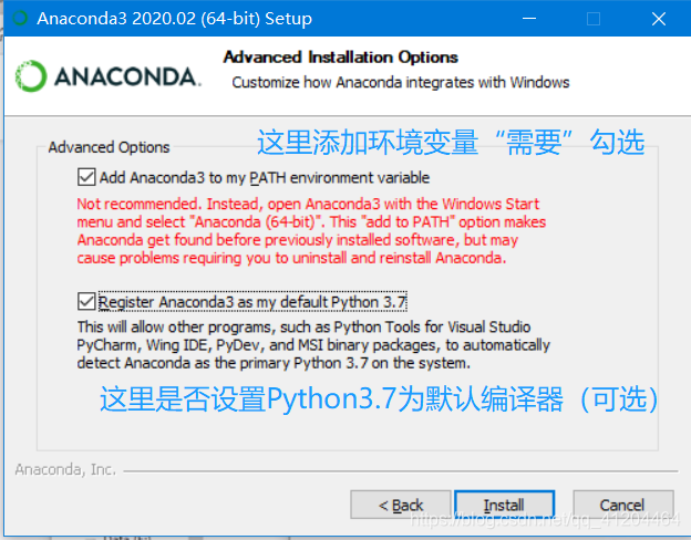 需要注意:添加环境变量的需要勾上√,如果默认使用PYthon3.7的第二个勾上,