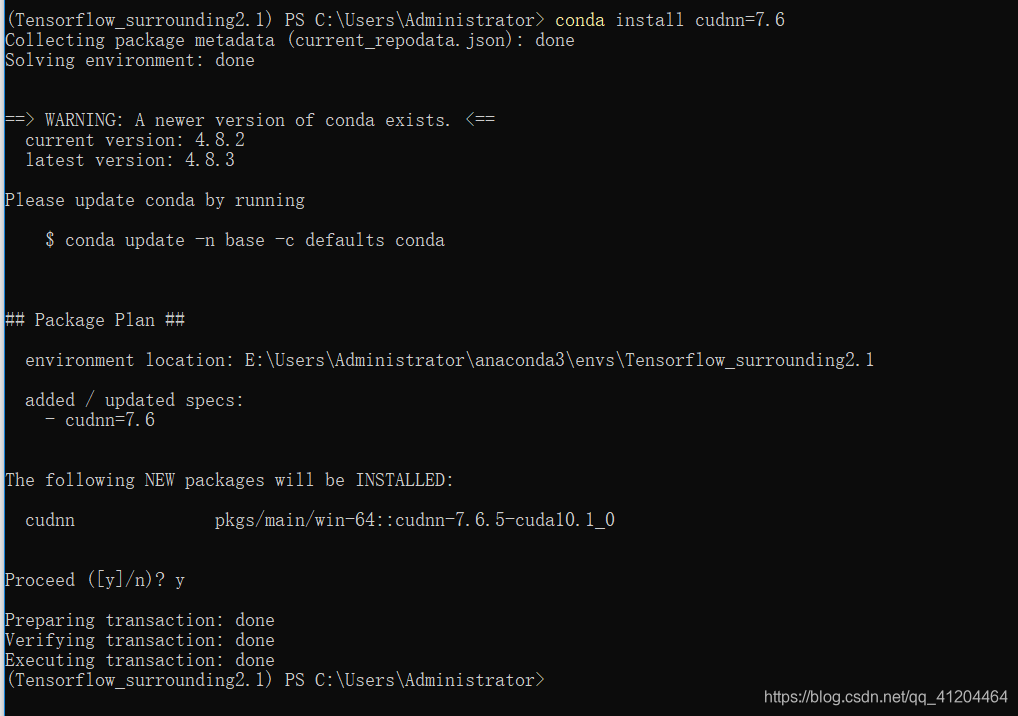 如果过程安装失败,很可能是此电脑不支持英伟达的GPU加速;或者GPU驱动版本过低。可以跳过上两步,直接安装Tensorflow。