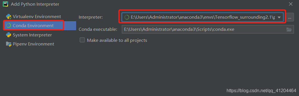 3)设置环境变量,使用之前在Anaconda创建好的环境:Tensorflow_surrounding2.1
