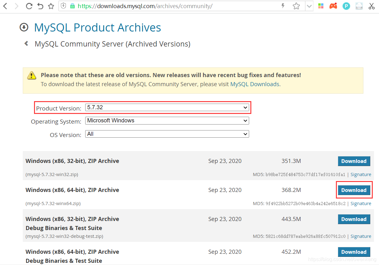 历史版本地址:https://downloads.mysql.com/archives/community/
