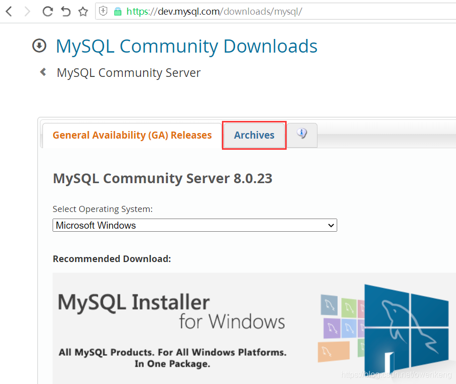 1.2.社区版下载地址:https://dev.mysql.com/downloads/mysql/进入社区版下载界面默认显示的是最新发布的版本,如果下载其他版本选“Archives”在历史版本界面“Product Version”下拉框选择历史版本选择对应的操作系统,选“Downloads”下载。