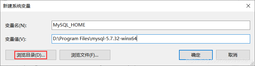 2.3 设置MySQL环境变量 在环境变量窗口的系统变量下方选择“新建”按钮,在弹出的“新建系统变量”窗口中,新建一个变量名为“MySQL_HOME”,变量值为MySQL的解压文件夹路径,路径可以浏览目录找到安装的MySQL路径,如:D:\Program Files\mysql-5.7.32-winx64也可以找到MySQL的安装路径复制粘贴到变量值框中,然后确定保存。