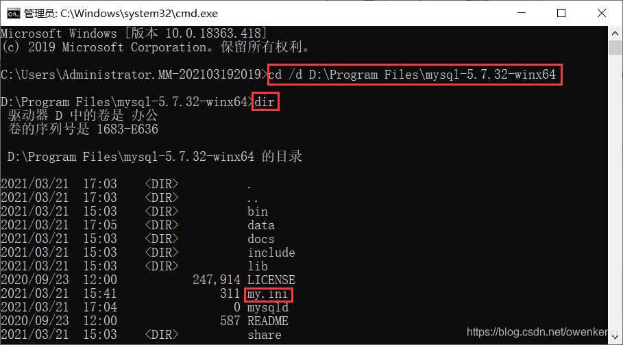 2.5 设置完成后可以使用Win+R快捷键或右键开始--运行菜单,在运行窗口输入CMD回车进入Windows DOS命令窗口,在命令窗口输入cd /d D:\Program Files\mysql-5.7.32-winx64进入文件夹后再输入dir 看一下是否MySQL的目录