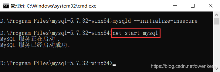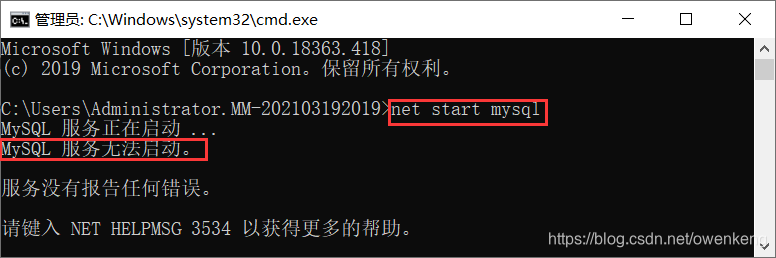 3.1 初始化完成后 在命令窗口输入net start mysql启动MySQL服务,如果出现“服务无法启动”需要确认初始化的命令是否有误重新初始化。