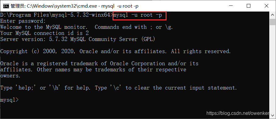 3.2 服务器启动后输入命令 mysql -u root -p或mysql -uroot -p回车提示输入密码,初始密码是空回车即可,如果有密码根据data文件夹下的.err文件打开查看密码进行登录。