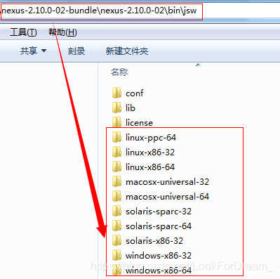 打开目录nexus-2.10.0-02-bundle\nexus-2.10.0-02\bin\jsw ,这个目录下面你会发现有很多系统版本的nexus环境,如下图所示: