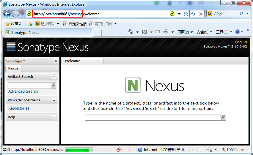 nexus服务启动之后,在浏览器中输入"http://localhost:8081/nexus/" 进行访问,如下图所示: