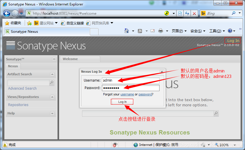 可以看到,nexus可以正常访问和登录,这就说明nexus已经安装成功。