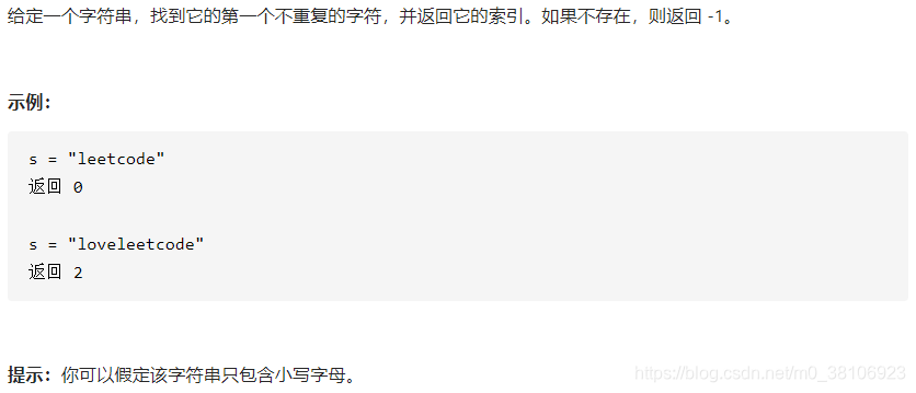 两次遍历,一次记录字符出现次数,一次找出第一个出现一次的索引。