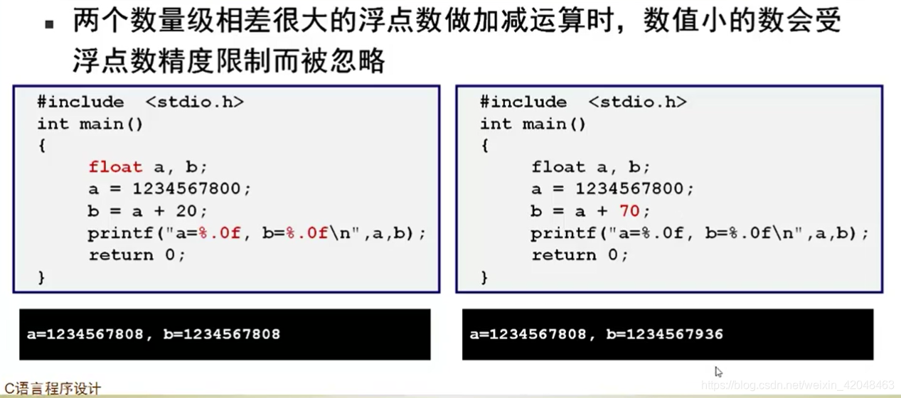 当我们将一个十进制小数赋值给一个单精度实型变量时,要经过一个从十进制小数转换为二进制小数的过程(内存中都是以二进制形式存储信息),由于并不是每一个十进制小数都有与之对应的二进制小数,因此在转换过程中可能存在数据精度丢失现象. 当需要以十进制形式输出这个二进制小数时,由于每一个二进制小数都有与之对应的十进制小数,在二进制小数转换为十进制小数的过程中,不会发生数据精度丢失现象. 但在一开始十进制小数转换为二进制小数的过程中,可能已经存在数据精度丢失现象,所以最终输出的这个十进制小数并不一定和最开始的那个值完全一致.