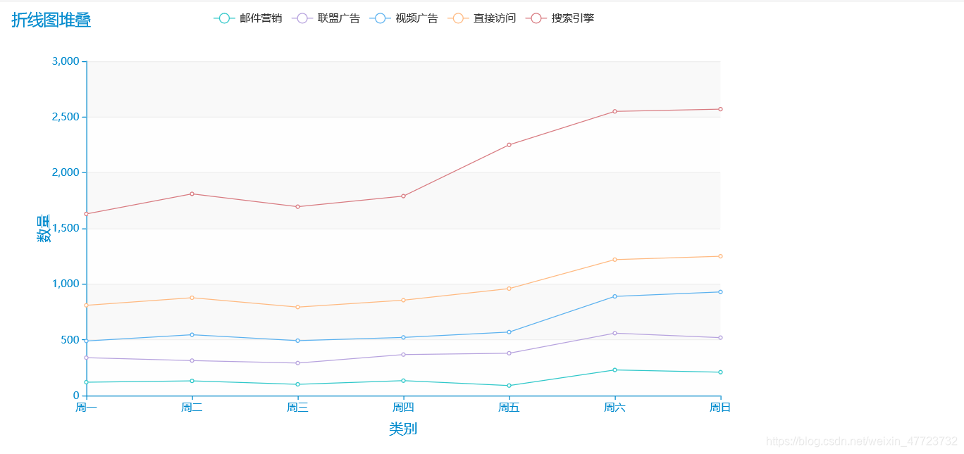 双折线图在一张图里面显示,肯定有一个相同的维度,然后有两个不同的数据集。比如一天的温度有最高的和最低的温度,我们就可以用这个来作为展示了。