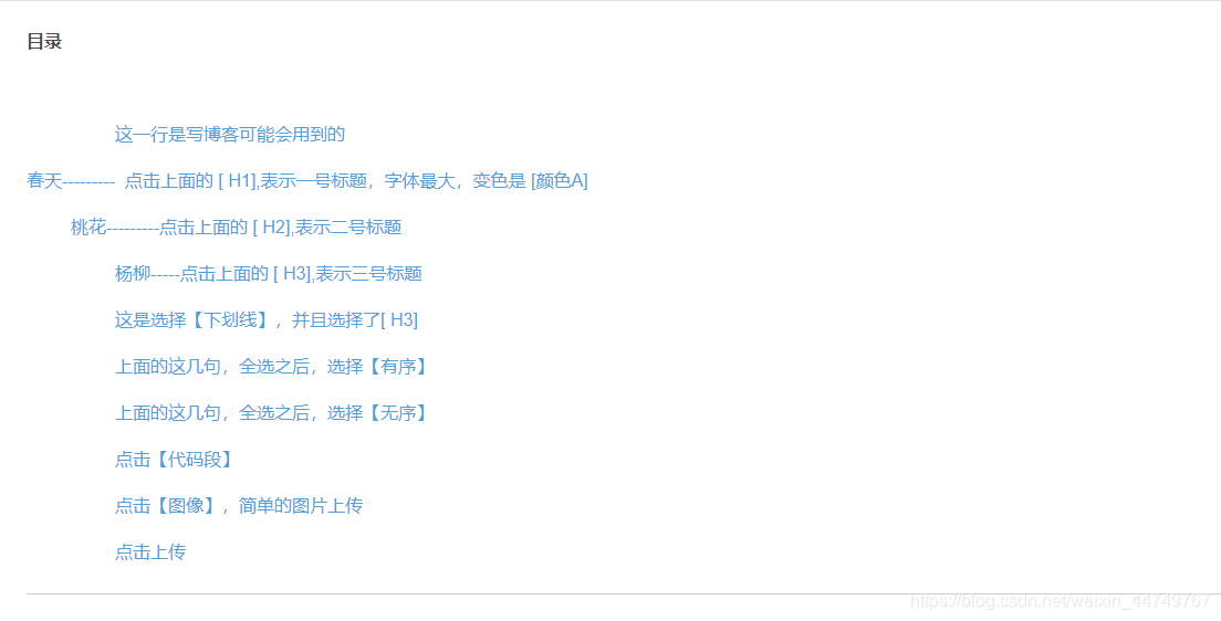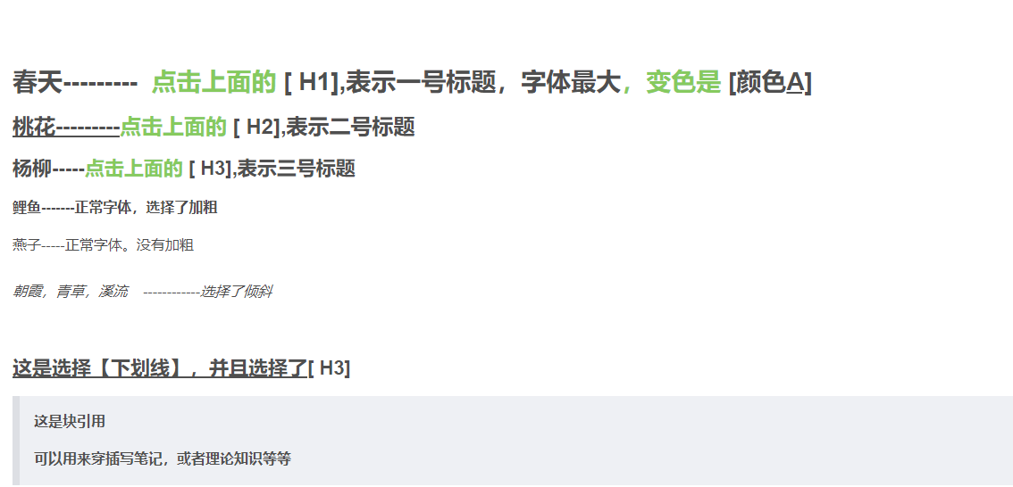 春天--------- 点击上面的 [ H1],表示一号标题,字体最大,变色是 [颜色A]