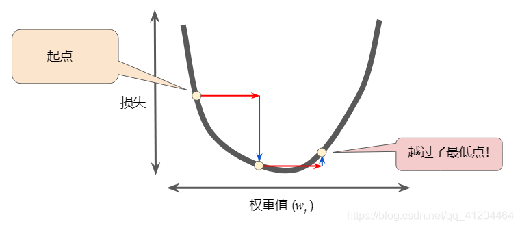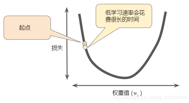 如果选择的学习率过小,就会花费太长的学习时间: