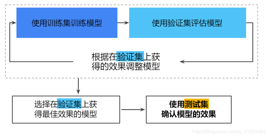 机器学习中可以将数据集分为两个子集,即训练集、测试集。更好的方式是将数据集分为三个子集,即训练集、验证集、测试集。