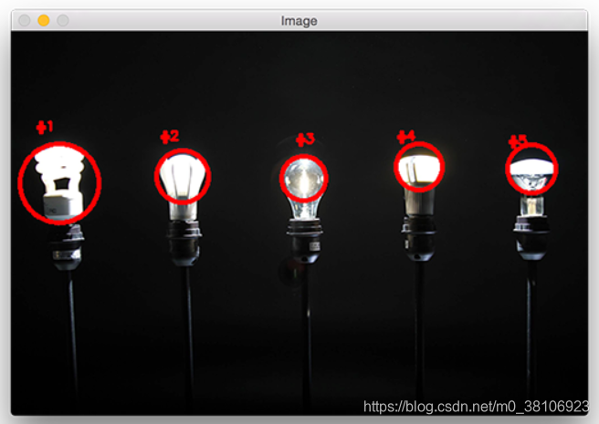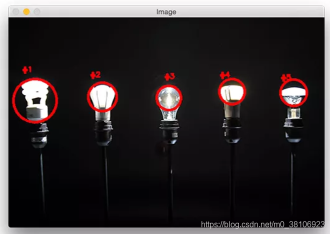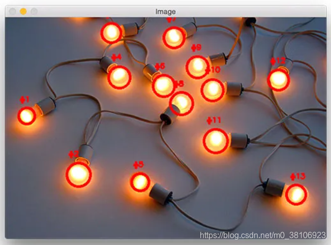 最后运行程序,可实现灯光亮点的检测和标记,每个灯泡都被独特地标上了圆圈,圆圈围绕着每个单独的明亮区域,效果如下所示: