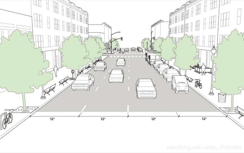 分配给驾车者,公共汽车,卡车,自行车和停放的汽车的车道的宽度是街道设计的敏感而关键的方面。车道宽度应考虑在给定街道划定空间的组合中,以满足所有需求,包括旅行车道,安全岛,自行车道和人行道。