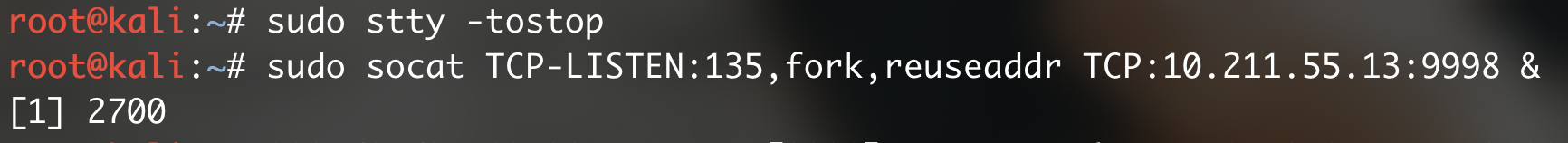 sudo socat TCP-LISTEN:135,fork,reuseaddr TCP:10.211.55.13:9998